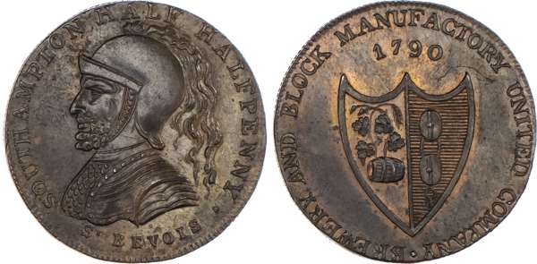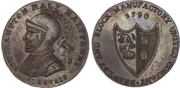 Southampton, Taylor, Moody & Co. Westwood’s Farthing 1790, Armoured bust of St. Bevois left, rev. Brewers‘ and Block-Tacklers’ arms, edge centrally milled, 23.5mm/5.75gm. (DH 96). Another the same but Bronzed Proof, 23.5mm/5.76gm. (DH 96), both good Extremely Fine, first with trace of lustre, second with iridescent toning. Both Rare. [2]