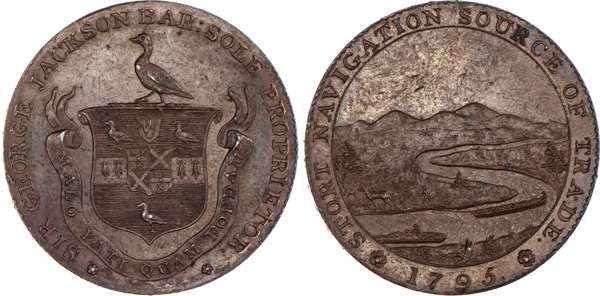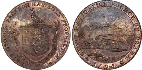 Bishop’s Stortford, Sir George Jackson Halfpenny 1795, Family crest and arms, rev. View of the Stort canal with horse-drawn barges, edge PAYABLE AT BISHOPS STORTFORD, 29mm/10.18gm. (DH 4). Another the same but a Bronzed Proof, 29mm/10.87gm. (DH 4), both good Extremely Fine, first with lustre and iridescence, second with reflective bronzing. Second scarce [2]