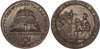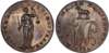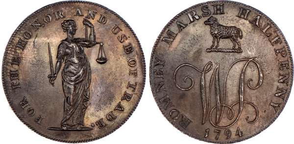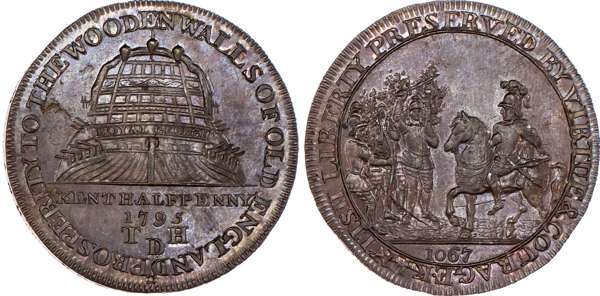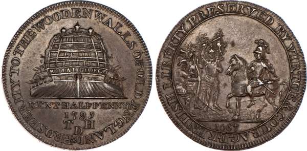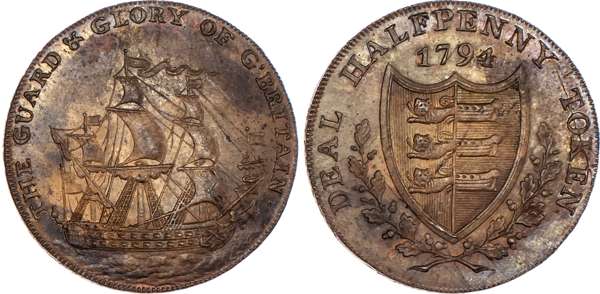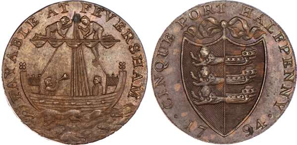 Deal, Richard Long (book-seller) halfpenny 1794, Man o’ war right, rev. arms of Cinque Ports, edge, PAYABLE AT RICHARD LONG’S LIBRARY, 30mm/10.09gm. DH 11). Deptford, Thomas Haycraft (ironmonger) Halfpenny 1793, Men of Kent approaching William the Conqueror, rev. Stern of the Royal George man o’ war, edge. PAYABLE IN DEPTFORD CHATHAM AND DOVER, 29.5mm/8.97gm. (DH 12). Another, but shorter water line on obv. 29mm/8.88gm. (DH 13a). Dimchurch, William Parris (Freeholder) halfpenny 1794 Sheep crest over WP cypher, rev. Justice standing, edge PAYABLE AT W PARRIS DIMCHURCH .X.X.X. 29mm/9.75gm. (DH 15). Faversham. John Crows, (brasier) Halfpenny 1794, An ancient sloop, rev. Cinque Ports Arms, edge PAYABLE AT JOHN CROWSS COPPERSMITH, 28.5mm/9.26gm. (DH 20), all good Extremely Fine except for DH 12 which is about Extremely Fine but very rare RRR), all prettily toned, DH 13a particularly so with traces of lustre and iridescence, last scarce. [5]
