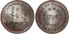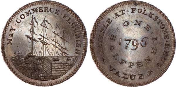 Folkestone, Skidmore's Halfpenny 1796, circular legend around date, rev. ships at quayside, edge diagonal milling over SKIDMORE HOLBORN LONDON, 28.5mm/12.66gm. (DH 21), good Extremely Fine with reflective iridescence. Rare.