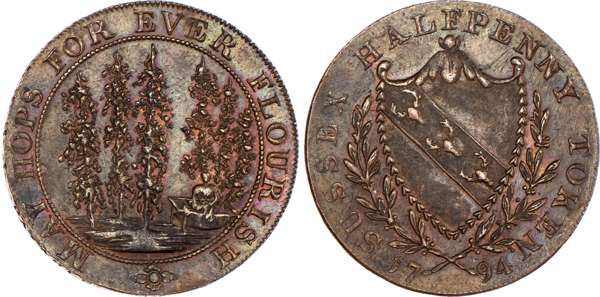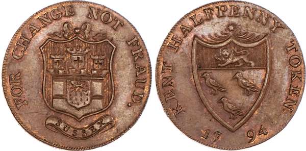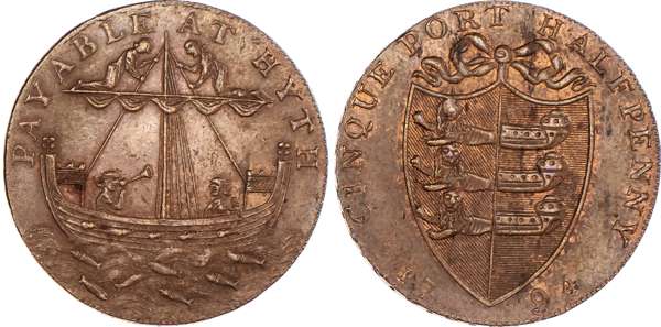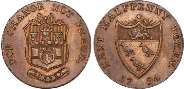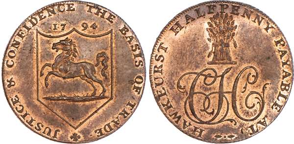 Hawkhurst, Charles Hider Halfpenny 1794. Prancing horse of Kent arms, Wheatsheaf over CH cypher, edge CHARLES HIDERS, rest diagonally milled, 28.5mm/9.39gm. (DH 30). Hythe, Richard Shipden halfpenny 1794, An ancient sloop, rev. Cinque Port arms, edge AT RICHARD SHIPDEN’S, 29mm/9.48gm. (DH 31). Lamberhurst, Thomas Foster (hop-farmer) Halfpenny 1794, View of a picker in a hop field, rev. Family Arms, edge PAYABLE BY T FOSTER LAMBERHURST, 29mm/9.36gm. (DH 34). Lamberhurst, John Gibbs (grocer) Halfpenny 1794, Arms of Canterbury, rev. Arms of Chichester, edge PAYABLE BY I. GIBBS LAMBERHURST ++, 28mm/9.11gm. (DH 35). Another the same, but edge PAYABLE BY +I+ GIBBS SUSSEX, 28mm/9.84gm. (DH 35a), all Extremely Fine or better – particularly first which has almost full lustre, others have only traces of lustre. [5]