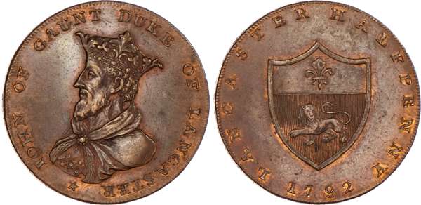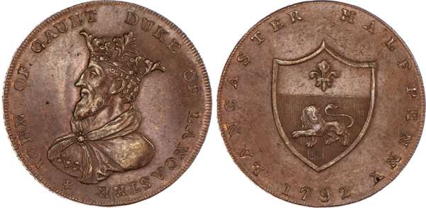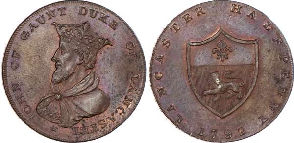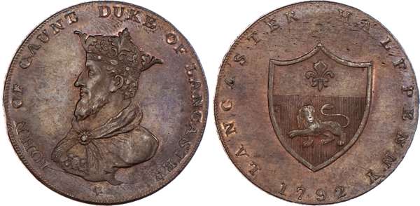 Lancaster, Thomas Worswick & Sons Halfpenny 1792, Same as above but instead date 1792, 30mm/12.21gm. (DH 23). Another similar but crown points to U, 29.5mm/12.61gm. (DH 24). Another similar but slight spacing diffs. 30mm/12.07gm. (DH 26). Another similar but centre of crown to K, 29.5mm/12.57gm. (DH 28), all good Extremely Fine with traces of lustre, last two with good iridescence. DH 26 Rare. [4]