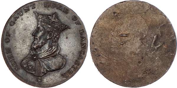 Lancaster, Thomas Worswick & Sons Uniface obverse die trail of DH 28 (1792), Bust left of John of Gaunt, rev. flat, edge PAYABLE AT THE WAREHOUSE OF THOMAS CLARKE, 30mm/12.60gm (DH 27), Extremely Fine or better, toned with some reflection. Of the highest rarity, Unique ?