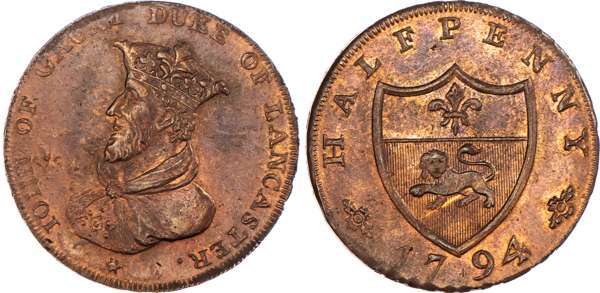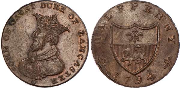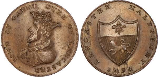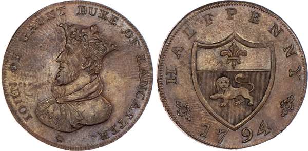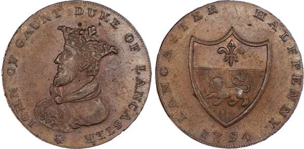 Lancaster, Thomas Worswick & Sons Halfpenny 1794, Bust left of John of Gaunt – no star below, rev. Lancaster Arms, edge PAYABLE IN LANCASTER LONDON OR BRISTOL, 29.5mm/9.44gm. (DH 39). Another similar but with star, 28.5mm/9.57gm. (DH 41). Another similar but much larger letters on rev. 29mm/0.79gm. (DH 43). Another the same but edge PAYABLE AT THE TEMPLE OF THE MUSES, 29mm/9.48gm. (DH 43b). Another but slightly different spacing, 28mm/8.74gm. (DH 44). All Extremely Fine or better and toned, second particularly lustrous. [5]