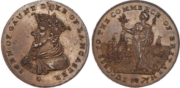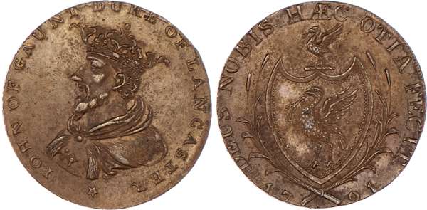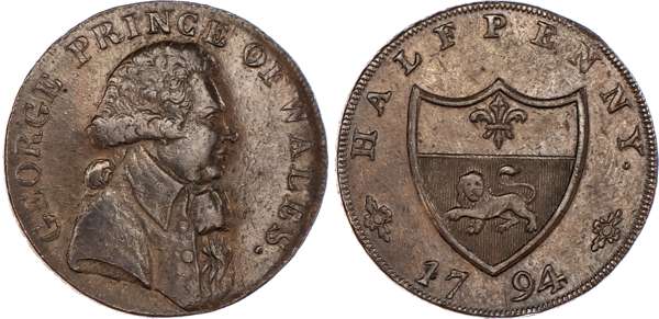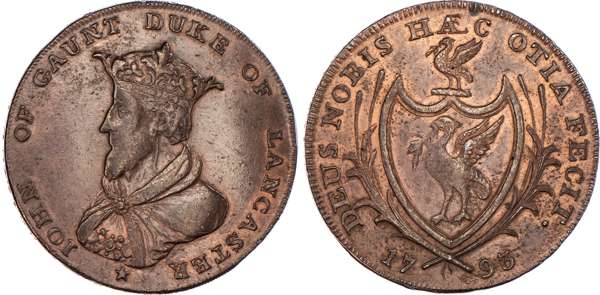 Lancaster, Thomas Worswick & Sons (Mule and contemp. imitation) Halfpenny 1791, Bust left of John of Gaunt, rev. Arms of Liverpool (Thomas Clarke’s token), edge PAYABLE IN LONDON, rest engrailed, 27.5mm/7.49gm. (DH 49). Another dated 1793, and rev. from a diff. die (DH 107), edge PAYABLE AT LIVERPOOL OR BRISTOL +, 29mm/10.91gm. (DH 50). Another but Lincs. rev, Britannia standing, edge PAYABLE AT BANBURY OXFORD OR READING, 29.5mm/10.66gm. (DH 54a). Another mule but with Middx. obv, George Prince of Wales right, 29.5mm/10.91gm. (DH 55a), generally Extremely Fine for issue, last very crudely struck – all four Very Rare ‘RR’. [4]