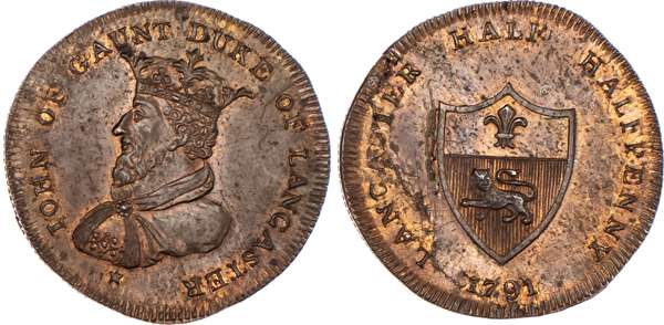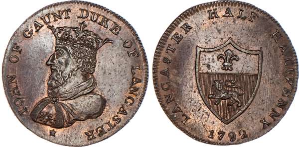 Lancaster, Thomas Worswick & Son’s (issued by Westwood for collectors) Farthing 1791, Bust left of John of Gaunt, rev. Lancaster arms, edge centrally milled, 23mm/5.16gm. (DH 151). Another the same but on a much larger flan 25mm/5.10. (DH 151. Another but dated 1792 23.5mm/4.96gm. (DH 152), all good Extremely Fine – first rev. a little weakly struck, last two with considerable amounts of original lustre, all rare ‘R’. [3]