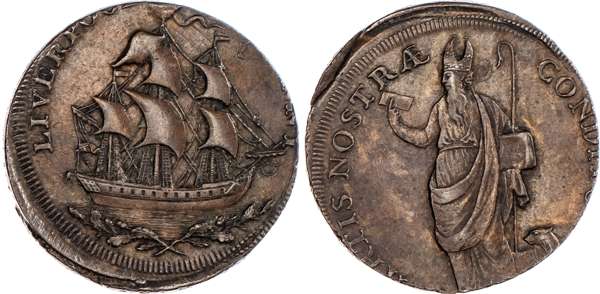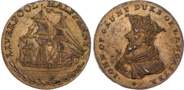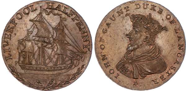 Liverpool, Thomas Clarke Mule Halfpenny, Ship left in full sale, rev. bust left of John of Gaunt (as Lancs 29), edge CURRENT EVERYWHERE, 29mm/9.68gm. (DH 114). Another the same but edge plain, 29mm/9.29gm. (DH 114a), Another mule, ship in full sail, rev. Bishop Blaize standing left (as Yorks 51), 28.5mm/10.63gm. (DH 115), first two Extremely Fine and toned, third badly mis‑struck and toned , DH 114a very rare ‘RR’ and mis-strike also rare. [3]