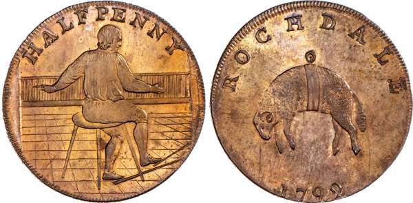 Rochdale, John Kershaw (mercer & draper) Halfpenny 1791/0, Weaver at loom, rev. a fleece, edge PAYABLE AT THE WAREHOUSE OF JOHN KERSHAW, 29.5mm/12.51gm. (DH 140var). Another but dated 1792, 30mm/11.90gm. (DH 142), both good Extremely Fine, first darkly toned with iridescence, second lightly toned and proof‑like, first apparently unrecorded as an overdate, second rare. [2]