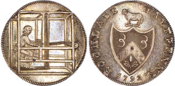 Rochdale, John Kershaw Silver Proof Halfpenny 1792, Weaver at a box- loom, rev. arms of Rochdale, edge PAYABLE AT THE WAREHOUSE OF JOHN KERSHAW, 30.5mm/13.39gm. (DH 143), good Extremely Fine, blue iridescence to brilliant reflective fields, small carbon spot in centre of shield on rev. Extremely Rare ‘RRR’