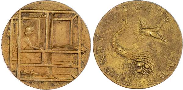 Rochdale, John Kershaw mule Halfpenny 1792, Arms of Rochdale, rev. bees and hive (as Camb 12), edge PAYABLE IN LONDON, 29.5mm/10.55mm. (DH 148). Another mule Halfpenny - rev mounted Queens Bays dragoon (as Norfk 46), edge PAYABLE IN LONDON, 29mm/9.99gm. (DH 149). Another the same but edge - WILLEY SNEDSHILL BERSHAM BRADLEY, 30mm/11.42gm. (DH 149b [87Bis]). Another mule and in brass – Man in a box loom rev. dove and cornucopia (as Hants. 11) edge PAYABLE IN LONDON, 28.5mm/9.36gm. (DH 150var), first three good Extremely Fine, third fully lustrous, last good Very Fine with yellow toning. Last two extremely rare ‘RRR’, other two scarce. [4]