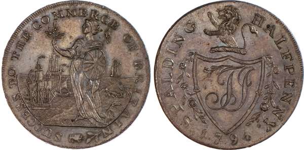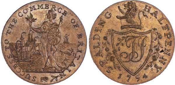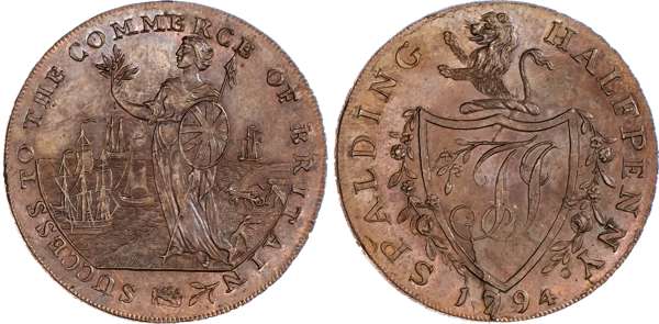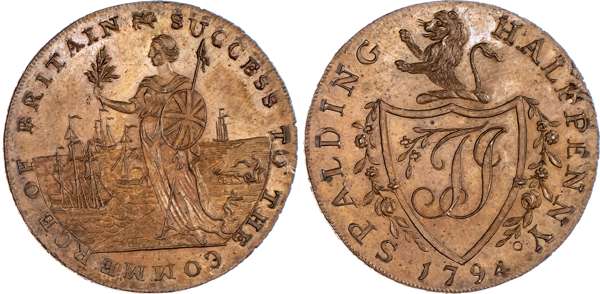 Spalding. Thomas Jennings (ironmonger & stationer) Halfpenny 1794, Britannia standing left viewing navy, rev. TJ cypher in shield demi-lion crest above, edge PAYABLE AT T JENNINGS’S SPALDING & HOLBEACH, 29mm/9.20gm. (DH 4). Another similar but small lion in obv. legend, 29mm/9.76gm. (DH 5). Another but tail of demi-lion nearer legend, 29mm/10.38gm. (DH 6). Another the same but edge PAYABLE AT I JORDANS SPALDING & HOLBEACH, 28.5mm/9,67gm. (DH 6a). Another the same but edge plain, 29mm/9.99gm. (DH 6e), all good Extremely Fine and handsomely toned with traces of lustre, DH 6a with reflective toning, DH 4 and 6a scarce, DH 6e very rare ‘RR’. [5]