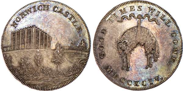 Norwich, Richard Bacon Silver Proof Halfpenny 1794, View of Norwich castle, rev. Hanging fleece, edge Richard Bacon Cockey Lane, 29mm/11.72gm. (DH 13), good Extremely Fine, proof‑like surfaces – reflective with blue/pink iridescence, superb and extremely rare ‘RRR’.