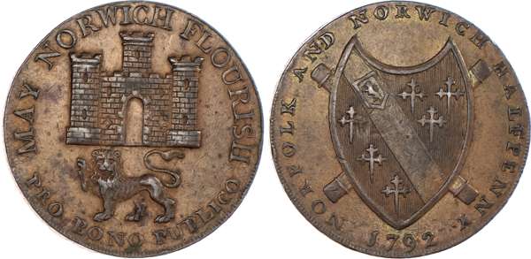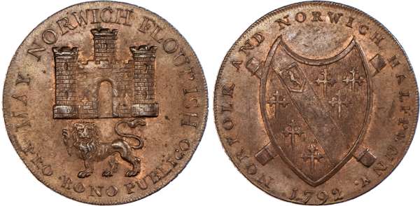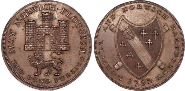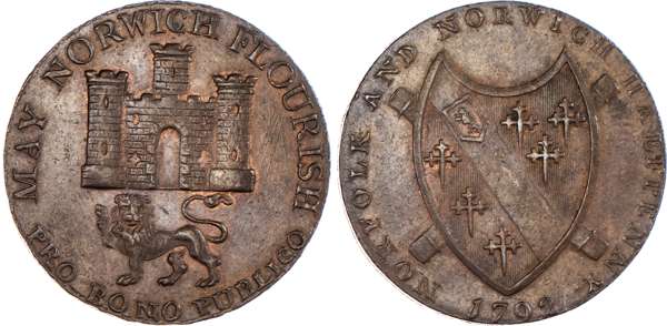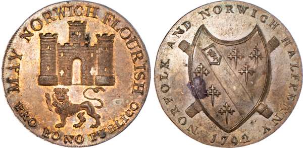 Norwich, Nathaniel Bolingbroke (haberdasher & silversmith) Halfpenny 1792, Arms of Norwich rev. Arms of Duke of Norfolk, edge PAYABLE AT N BOLINGBROKE S HABERDASHER &C NORWICH .X., 29.5mm/10.04gm. (DH 14). Another the same but bronzed, on a large flan with a plain edge, 31mm/13.18gm. (DH 14c). Another similar but annulet rather than period after FLOURISH, 29.75mm/10.64gm. (DH 15). Another the same but edge plain, 29.5mm/10.38gm. (DH 15a). Another similar but no period or annulet after FLOURISH, 29.5mm/10.53gm. (DH 16). Another the same but edge plain and not in collar, 28.5mm/10.77gm. (DH 16e), DH 14, 15, and 16 good Extremely Fine with some mint lustre; DH 15a and 16e about Extremely Fine and toned – both very rare ‘RR’; DH 14c good Extremely Fine, well struck and bronzed, Extremely Rare ‘RRR’. [6]