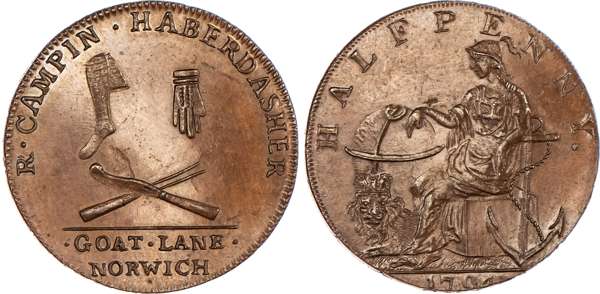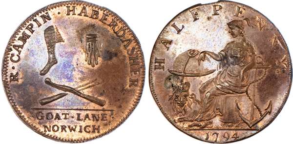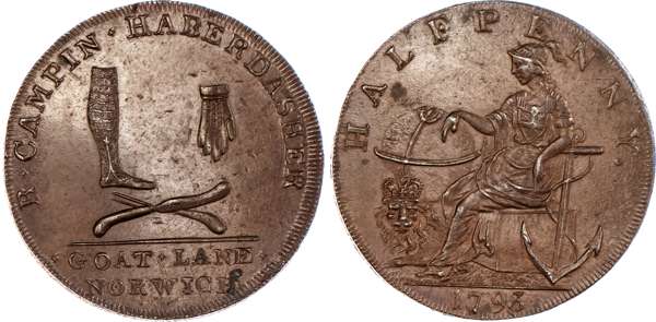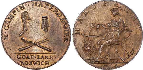 Norwich, Robert Campin (haberdasher) Halfpenny 1793, Stocking, glove knife and fork, rev. Britannia in the form of Hope sitting by globe, edge plain, 29mm/10.06gm. (DH 20b). Another but dated 1794, 28.5mm/9.80gm. (DH 21). Another the same but edge PAYABLE AT T JENNINGS SPALDING 7 HOLBEACH -X-, 28.5mm/9.85mm. (DH 21a). Another but edge plain 29.5mm/9.66gm. (DH 21d), DH 20b Extremely Fine and toned, DH 21 and 21a better with traces of lustre, DH 21d especially lustrous – almost proof‑like, DH 20b and 21a Extremely rare ‘RRR’. [4]