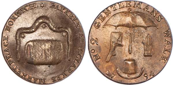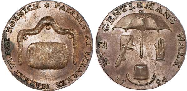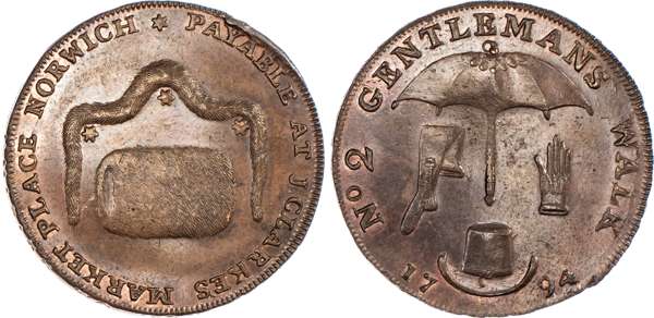 Norwich, Joseph Clarke (hatter, hosier & furs seller) Halfpenny 1794, Fur muff and stole, rev. hat, stocking, glove and umbrella, edge plain and rounded, 28.5mm/9.80gm. (DH 22), Another the same but edge PAYABLE x AT x CRONEBANE x OR * IN * DUBLIN, 28.5mm/10.03gm. (DH 22a). Another but edge PAYABLE IN LANCASTER LONDON OR BRISTOL, 30mm/9.81gm. (DH 22b), all good Extremely Fine with discernible amounts of original lustre, small stain on DH 22a obv. which is a scarce edge. [3]