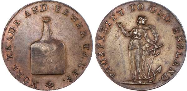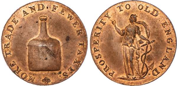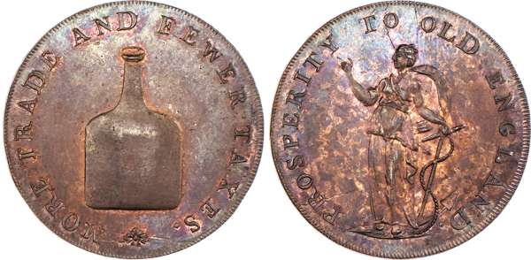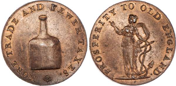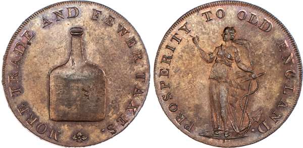 Norwich, Richard Dinmore & Son (saddler, ironmonger and hemp merchant) Halfpenny, Brandy bottle, rev. Hope standing left, edge RICHARD DINMORE & SON NORWICH, 29mm/9.83gm. (DH 23). Another the same but edge plain, 29mm/9.96gm. (DH 23b). Another similar but rev. from different die, 29mm/10.44gm. (DH 24). Another the same but edge PAYABLE IN LONDON BRISTOL & LANCASTER -x-, 28.5mm/10.24gm. (DH 24a). Another similar but edge plain, 29.5mm/10.64gm. (DH 24c), First Extremely Fine with trace of colour, rest good Extremely Fine with varying degrees of lustre – last almost proof-like. [5]