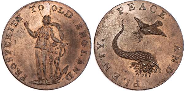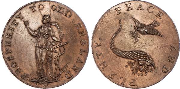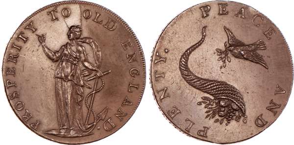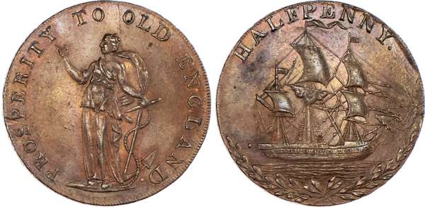 Norwich, General Circulation Halfpenny undated, Hope standing left with anchor, rev. man of war, olive wreath below, edge CURRENT EVERYWHERE, 28.5mm/10.31gm. (DH 25). Another but rev. Dove over cornucopia and bronzed, edge PAYABLE AT THE SHOP OF DUNHAM 7 YALLOP GOLD-SMITHS, 28.5mm/11.46gm. (DH 26b). Another the same but edge - EMSWOTH HALFPENNY PAYABLE BY JOHN STRIDE, 28.5mm/10.65gm. (DH 26c). Another the same but edge plain and rounded, 28.5mm/10.56gm. (DH 26e), all generally good Extremely Fine with traces of original lustre apart from second which is bronzed and rare thus. [4]