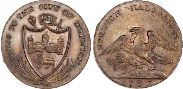 Norwich, Dunham & Yallop Halfpenny 1793, Arms of Norwich, rev. spread eagle with purse in beak (crest), PAYABLE AT THE SHOP OF DUNHAM & YALLOP GOLD-SMITHS, 28.5mm/11.02gm. (DH 31). Another the same but edge plain, 28.5mm/10.82gm. (DH 31a). Another but shield now emblazoned or, 28.5mm/10.78gm. (DH 32). Another but dated 1796 Hope standing holding anchor and advertisement, rev. Shop front, edge diagonally milled, 28.5mm/10.69gm. (DH 33), all good Extremely Fine, first with a lot of original mint lustre, others toned, DH 31a very rare edge ‘RR’. [4]