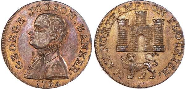 Northampton, George Jobson (banker) specious ? Halfpenny 1794, Bust left of Jobson, rev. Arms of Northampton, edge PAYABLE IN LANCASTER LONDON OR BRISTOL, 28mm/9.08gm. (DH 1), Extremely Fine or better with some original lustre, uncommon.