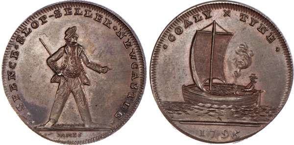 Newcastle‑upon‑Tyne, Jeremiah Spence (Thomas Spence for his father - a Tyneside slop-seller) Halfpenny 1795, Sailor standing right, rev. manned coal-barge sailing left, edge plain, 30.5mm/14.36gm (DH 3a), good Extremely Fine, on a very thick flan and bronzed. Very rare ‘RR’.