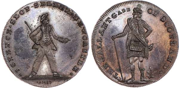 Newcastle‑upon‑Tyne, Thomas Spence mule Halfpenny 1797, Sailor standing right, rev. Kilted highlander standing in national dress, edge X IN COINS IN X COINS X LONDON X LONDON (blundered legend), 29mm/12.58gm. (DH 10), good Extremely Fine, darkly toned and almost proof-like, scarce as type and very rare with such an edge legend.