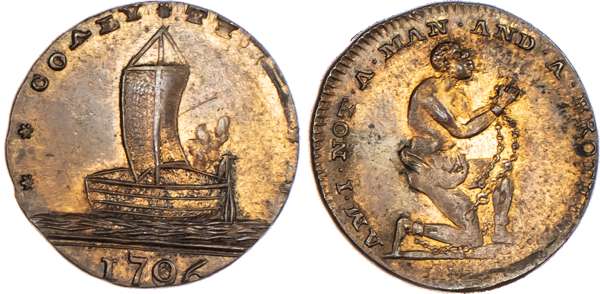 Newcastle‑upon‑Tyne, Thomas Spence mule Farthing 1796, Empty coal-barge sailing left, rev. shackled and kneeling black slave, edge diagonally plain and rounded, 20.5mm/3.53gm. (DH 34). good Extremely Fine, weakly struck but almost full original mint bloom, rare.