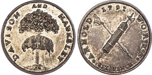 Arnold, Robert Davison & John Hawksley (worsted mill owners) silver washed base metal Sixpence 1791, Fleece hanging from tree, rev. fasces crossed with lance bearing cap of liberty, edge plain, 25.5mm/6.15gm. (DH 4), Extremely Fine but silvering on raised surfaces oxidised, Rare