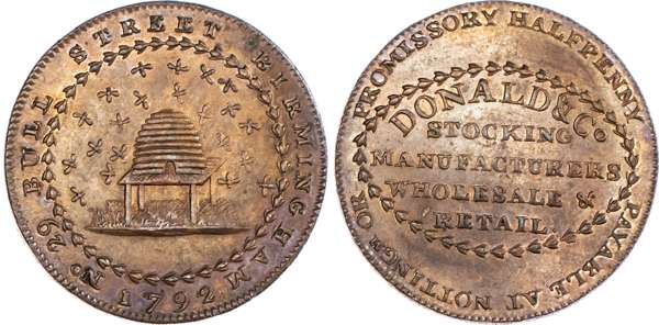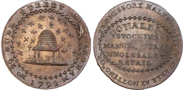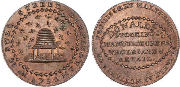 Nottingham, William Donald & Co. (stocking manufacturers and retailers) Halfpenny 1792, Bees and hive, rev. advertisement in wreath, edge plain, 30mm/`3.48gm. (DH 6). Another but ‘Promissory’ spelt correctly, 29.5mm/11.75gm. (DH 7). Another, similar but minor spacing diffs. on obv., 29mm/9,89gm. (DH 8), all Good Extremely Fine, first with some lustre and iridescence, others nicely and evenly toned, last with usual obv. die flaw. [3]