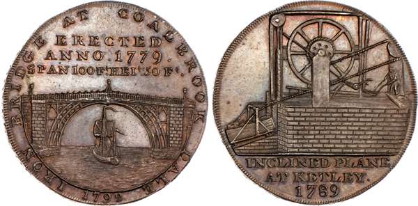 Coalbrook Dale, Richard Reynolds & Sons (ironworks) Halfpenny 1792, Sailing barge below iron bridge, rev. Inclined plane (barge lifting machinery), edge PAYABLE AT COALBROOK-DALE AND KETLEY, 30.5mm/14.33gm. (DH 7), good Extremely Fine, darkly toned but with trace of lustre – almost proof-like, very rare ‘RR’.