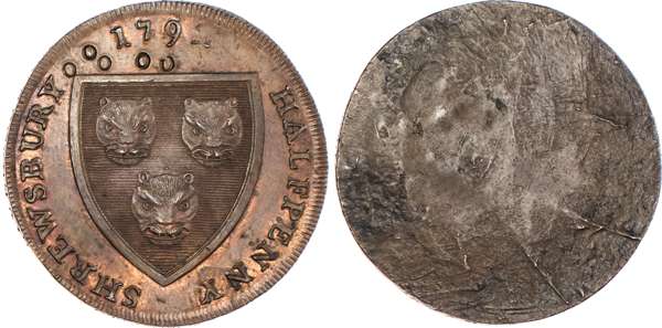 Shrewsbury, Isaac Wood (House of Industry – woollen manufactory) uniface trial for obverse die of Halfpenny 1792, Arms of Shrewsbury, last digit of date filled in, rev. blank, edge PAYABLE AT MACCLESFIELD LIVERPOOLOR CONGLETON -x-, 30.75mm/12.50gm. (DH 18), good Extremely Fine, toned with some original lustre, 5x small 0s punched near date. Of the highest rarity, if not unique, this the only example traced.