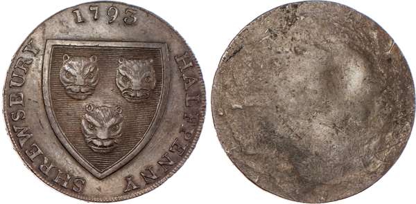 Shrewsbury, Isaac Wood uniface trial for obverse die of Halfpenny 1793, Arms of Shrewsbury, rev. blank, edge PAYABLE AT SHREWSBURY, 29.5mm/11.26gm. (DH 19 bis), almost Extremely Fine and toned, Unique ?