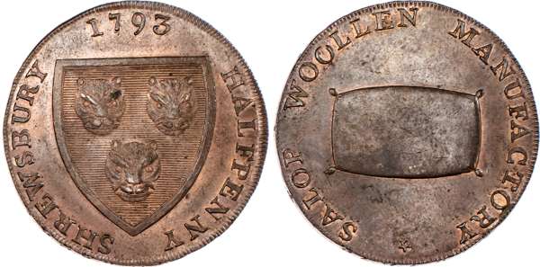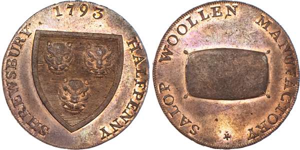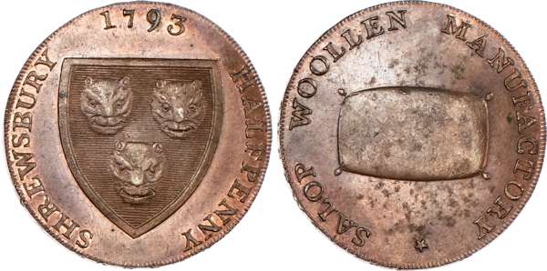 Shrewsbury, Isaac Wood Halfpenny 1793, Arms of Shrewsbury, rev. wool pack, edge PAYABLE AT SHREWSBURY + +, 30mm/11.30gm. (DH 20). Another similar but greater space between rev. legend, 30mm/10.95gm. (DH 21). Another similar, but slight spacing difference on rev. 30mm/11.30gm. (DH 22), all three good Extremely Fine with some original lustre – especially last which is nearly fully lustrous. [3]