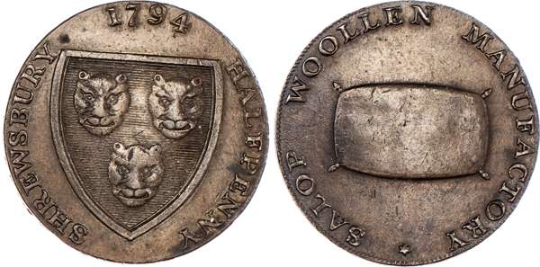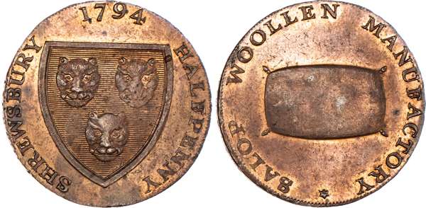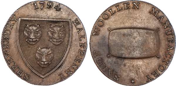 Shrewsbury, Isaac Wood Halfpenny 1794, Arms of Shrewsbury, rev. wool pack, edge BIRMINGHAM REDRUTH & SWANSEA 29mm/9.57gm. (DH 25a). Another the same but edge PAYABLE AT LONDON LIVERPOOL OR BRISTOL, 29mm/9.15gm. (DH 25d). Another the same but edge diagonally milled, 29mm/9.96gm. (DH 25e), DH 25a and 25e Extremely Fine and toned, DH 25d good Extremely Fine with almost full lustre, a little weakly struck though. Last very rare edge ‘RR’. [3]