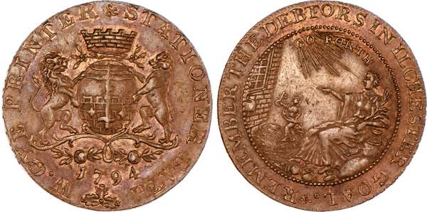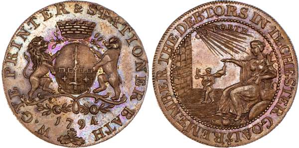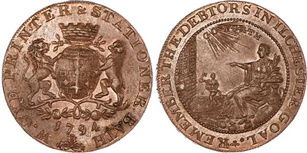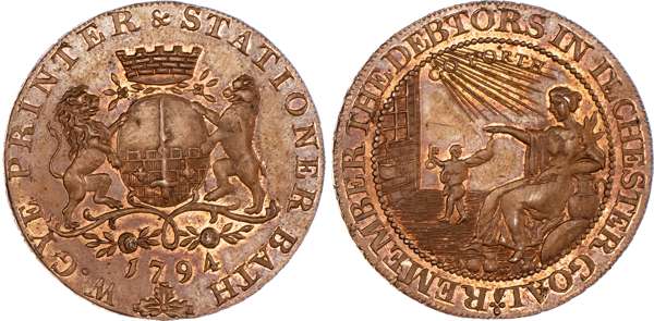Bath, William Gye (bookseller, printer and stationer) Halfpenny 1794, Arms of Bath, rev. Benevolence instructing the opening of gaols, edge PAYABLE AT W. GYE’S PRINTER BATH X.X, 29.5mm/9.94gm. (DH 32). Another the same but edge PAYABLE BY JAMES TEBAYS HASTINGS, 29.5mm/9.65mm. (DH 32a). Another similar but bends in the coat of arms, 30mm/9.49gm. (DH 33). Another similar but boy has no flowing robe, 29mm/9.95gm. (DH 34). Another the same but edge BRIGHTON CAMP HALFPENNY, 29mm/9.35gm. (DH 34a), all good Extremely Fine, first three proof‑like with much lustre, last two not quite as much lustre and last a little weakly struck, DH 32a and 34a very rare ‘RR’, DH 32 rare ‘R’. [5]