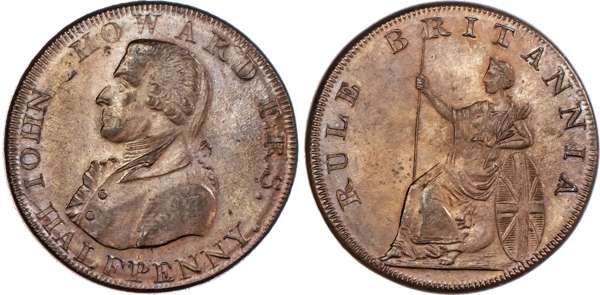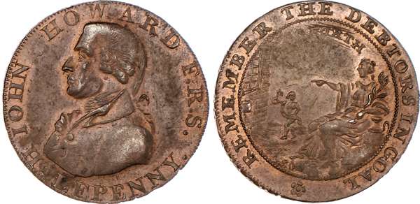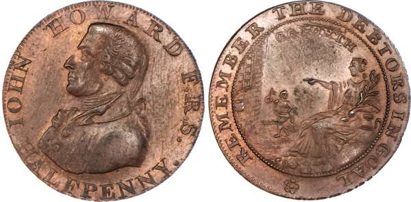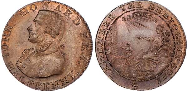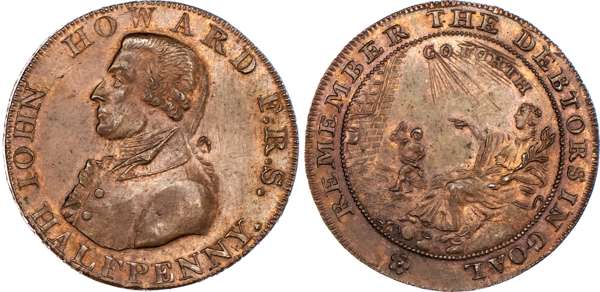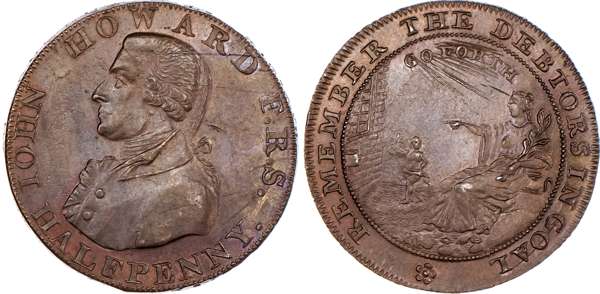 Bath, William Gye Halfpenny 1794, Bust left of John Howard the prison reformer, rev. Benevolence instructing the opening of gaols, edge PAYABLE IN LANCASTER LONDON OR BRISTOL, 28mm/9.34gm. (DH 35a). Another similar but different rev. legend, edge PAYABLE IN DUBLIN OR LONDON .+.+., 28.5mm/8.98gm. (DH 36a). Another the same but edge PAYABLE IN LANCASTER LONDON OR BRISTOL, 28mm/9.23gm. (DH 36c). Another the same but edge PAYABLE AT LONDON OR DUBLIN, 29mm/9.38gm., (DH 36d). Another the same but edge MASONIC HALFPENNY TOKEN MDCCXCIV, 28mm/9.41gm. (DH 36e). Another – mule halfpenny no date, rev. Britannia seated left, edge plain and rounded, 30mm/11.18gm. (DH 37), All Extremely Fine or better and all toned with small amounts of lustre, last with iridescence to toning, First two and last rare. [6]