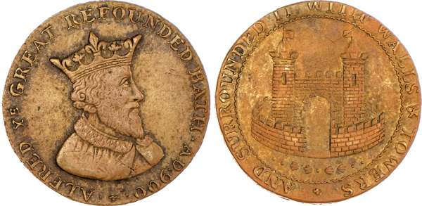 Bath, Payne & Turner (silversmiths) Halfpenny no date, bust left of Alfred the great, rev. castle gateway, edge PAYNE & TURNER SILVER-SMITHS BATH .+., 29.5mm/9.73gm. (DH 65). Another the same but in brass and edge I PROMISE TO PAY ON DEMAND ONE HALFPENNY -.-, 28mm/9.69gm. (DH 65a), First good Extremely Fine with iridescence and remains of original bloom, second good Very Fine with yellow toning ‑ this off‑metal extremely rare. [2]