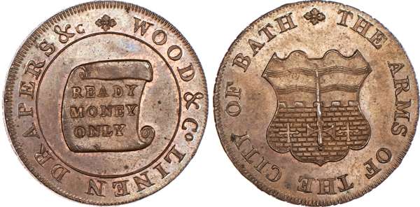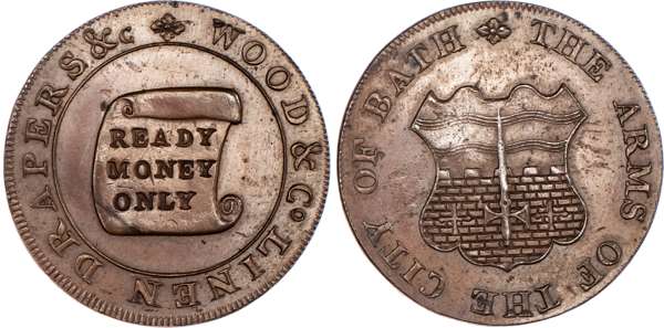 Bath, James Wood & Co. (linen drapers) by Kempson, Halfpenny undated, scroll with ‘READY MONEY ONLY’ rev. Arms of the City of Bath, edge VILLEY SNEDSHILL BERSHAM BRADLEY, 29.5mm/10.65gm. (DH 66a). Another the same but edge plain, 29mm/11.27gm. (DH 66b), both good Extremely Fine first with some lustre, second almost bronzed, last extremely rare variety ‘RRR’ [2]