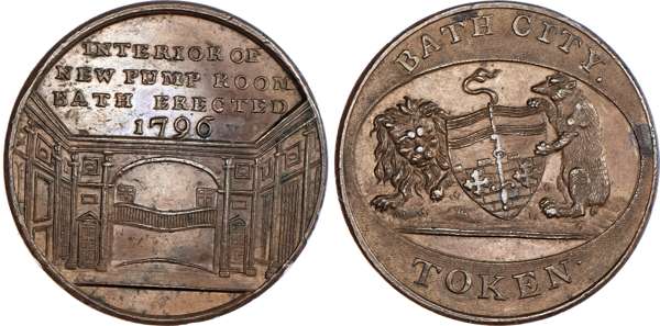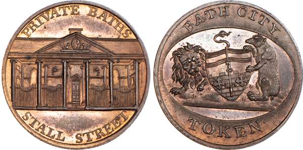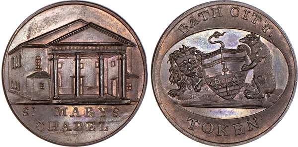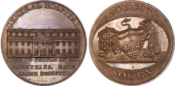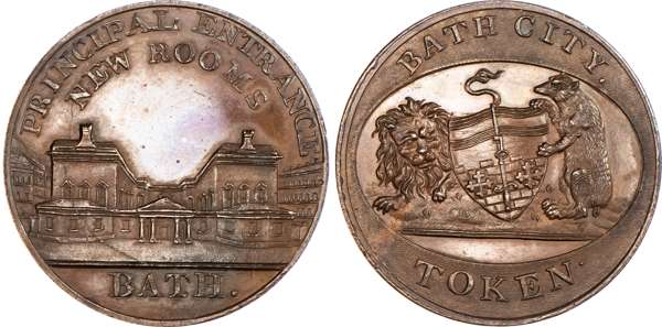 Bath, Kempsons ‘Buildings of Bath’ series Halfpenny undated, general Hospital, rev. Arms of Bath with supporters, edge plain, 28.75mm/13.61gm. (DH 75). Another but obv. Kensington Chapel, 28.75mm/12.82gm. (DH 76). Another but obv. St. Mary’s Chapel, 28.75mm/13.89gm. (DH 78). Another but obv. Private Baths Stall Street, 28.75mm/13.73gm. (DH 79). Another but obv. interior of the new Pump Room erected 1796, 28.75mm/13.14gm. (DH 82). Another but obv. Principle Entrance to New Rooms, 28.75mm/13.5gm. (DH 83), all good Extremely Fine, generally bronzed patination with much reflection except for DH 79 which has lustre, small carbon spot on DH 82, all scarce [6]