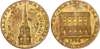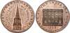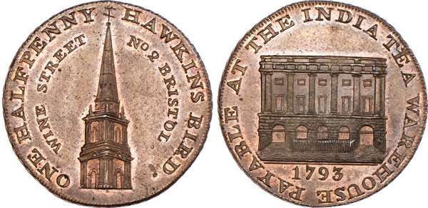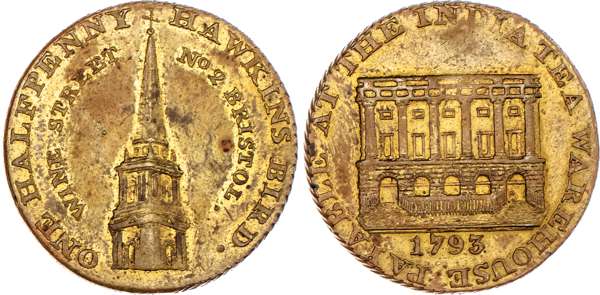 Bristol, Hawkins Bird (grocer and tea dealer) Halfpenny 1793, Spire of Christ Church, rev. façade of the India tea Warehouse, edge diagonally milled, 28mm/9.53gm. (DH 89). Another but in gilded brass, 28mm/10.02gm. (DH 89), first good Extremely Fine with almost full mint lustre, second Extremely Fine with some original gold lustre but patchily toned and extremely rare. [2]