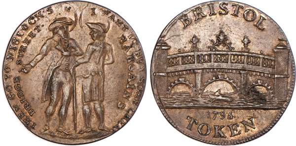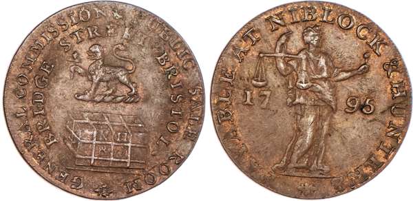 Bristol, James Niblock and William Hunter (auctioneers) Halfpenny 1795, Leopard crest over cloth bale, rev. Justice standing right, edge plain and rounded, 28mm/9.51gm. (DH 100). Another similar but slight spacing differences 28mm/9.35gm. (DH 101). Another the same but in brass, 28mm/8.92gm. (DH 101). Another but different halfpenny 1795, Two well‑dressed gentlemen standing talking, rev. view of Bristol Bridge, edge plain and rounded, 28mm/8.97gm. (DH 102), First three Very Fine or better, fourth Extremely Fine with trace of lustre, brass piece extremely rare in this off‑metal, last scarce. [4]