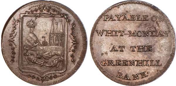 Litchfield, Samuel Barker (partner in a bank in Greenhill) Farthing, undated, Arms of Litchfield (dismembered bodies by church), rev. 5-line legend edge plain, 23.75mm/5.83gm. (DH 27), good Extremely Fine, almost bronzed in toning – hint of original mint lustre, rare.