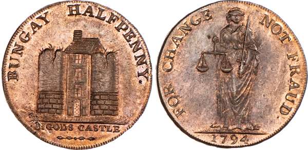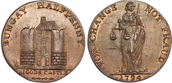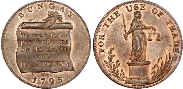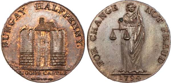 Bungay, Samuel Prentice, Samuel Delf & Matthias Abel (grocer, brazier and draper), Halfpenny 1795, hand holding scroll, rev. Justice standing on a pedestal, edge S PRENTICE S DELF M ABEL, 28.5mm/9.34gm. (DH 21), Another but view of the ruins of Bigod’s castle, rev. Justice standing facing, edge plain and rounded, 29.5mm/10.31gm. (DH 22). Another the same but edge PAYABLE IN DUBLIN OR LONDON, 29mm/9.27gm. (DH 22c). Another the same but edge PAYABLE IN LANCASTER LONDON OR BRISTOL (DH 22d), all good Extremely Fine, last with full original lustre others with more than a hint. [4]