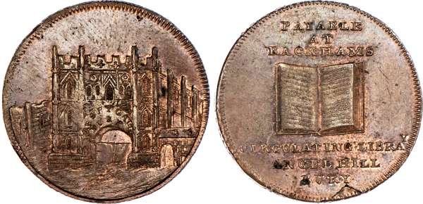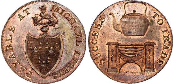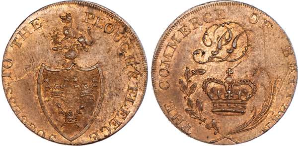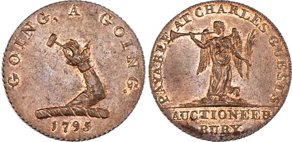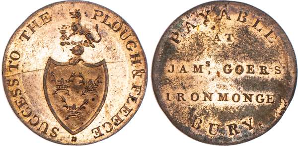 Bury St. Edmunds Philip Deck (bookseller and postmaster for the town) Halfpenny undated, Arms of the town, rev. His cypher over a crown in a wreath, edge PAYABLE AT P DECKS POST OFFICE BURY xxx, 28.25mm/10.40gm. (DH 26). Bury St. Edmunds, James Goer, (ironmonger) Halfpenny undated, Arms of the town, rev. 5-line legend, edge plain, 29mm/9.74gm. (DH 27). Bury St. Edmunds. Michael Apsey, (ironmonger and tinman) Halfpenny undated, Arms of the town, rev. kettle over fire‑grate, edge PAYABLE IN DUBLIN OR LONDON.+.+., 28.5mm/9.07gm. (DH 28a). Bury St. Edmunds and Harleston, John Rackham and Richard Leatherhead (bookseller & printer, and grocer) Halfpenny undated, View of abbey gate, rev. open library book, edge OR AT LEATHERHEAD’S .x. HARLESTON NORFOLK, 28mm/10.09gm. (DH 29). Bury St. Edmunds, Charles Guest (auctioneer) halfpenny 1795, arm with gavel crest, rev. Fame blowing trumpet left, edge diagonally milled, 28mm/8.54gm. (DH 30), all good extremely fine and all, more or less fully lustrous save DH 29which has traces of lustre and a couple of very small carbon spots on rev. [5]