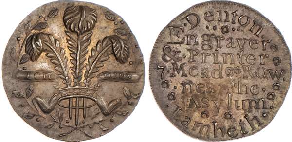 Lambeth, Denton mule Farthing 1796, a wheatsheaf with doves either side (as Cork 11) struck using halfpenny die, rev. Denton’s 5-line advertisement, edge plain 22mm/4.07gm. (DH 16). Another but obv. a castle (as Aberdeen 1) struck using a halfpenny die, 21.5mm/3.13gm. (DH 17). Another but obv. Prince of Wales Plumes (as Dublin 320) struck using a halfpenny die (DH 18), all good Extremally Fine, second a little weakly struck, all evenly toned, last with some lustre and all rare. [3]