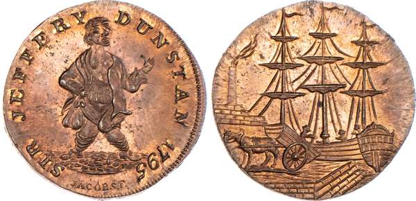 Lambeth, Denton Farthing 1795, Deformed dwarf, rev. 7-line legend, edge plain, 22mm/4.01gm. (DH 19). Another with muled rev. a crown in radiate circle (as Middx 1031) struck using a halfpenny die, 21.5mm/3.98gm. (DH 20). Another with muled rev. a ship docking (as N’land 25) struck using a halfpenny die, edge plain, 23mm/3.98gm. (DH 22), All good Extremely Fine, first and third with full blazing mint lustre, second evenly toned, all rare. [3]
