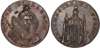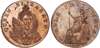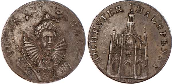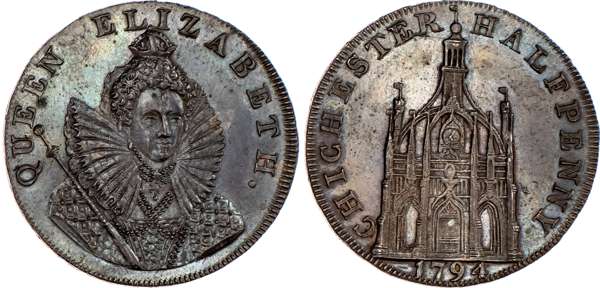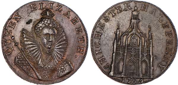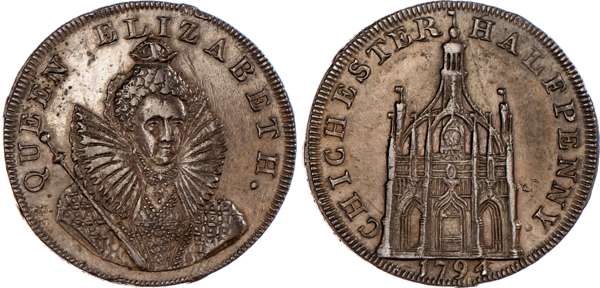 Chichester, James Dally Halfpenny 1794, Bust half right of Elizabeth I, rev. Market cross, edge PAYABLE AT DALLYS CHICHESTER, 29.5mm/10.12gm. (DH 15), Another the same but edge WILLEY SNEDSHILL BERSHAM BRADLEY, 30.25mm/10.93gm. (DH 15a). Another the same but edge RICHARD BACON COCKEY LANE,28.75mm/9.92gm. (DH 15c). Another similar but probably a contemporary copy, edge plain, 29mm/9.39gm. (DH 16a). Another but a mule, rev. Britannia seated left (as Hants 13), PAYABLE IN LONDON – rest engrailed. (DH 17a), DH 15 and 17a good Extremely Fine, first toned with blue iridescence, second almost bronzed – other three good Very Fine and toned and all extremely rare ‘RRR’. [5]