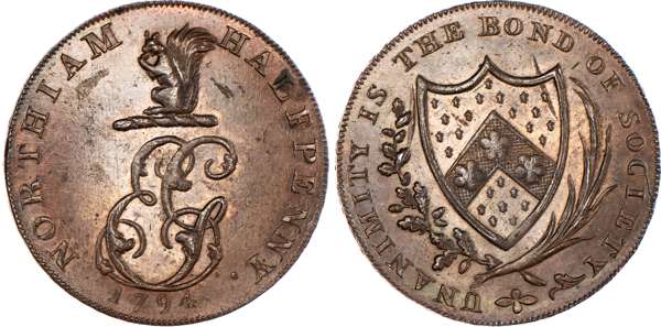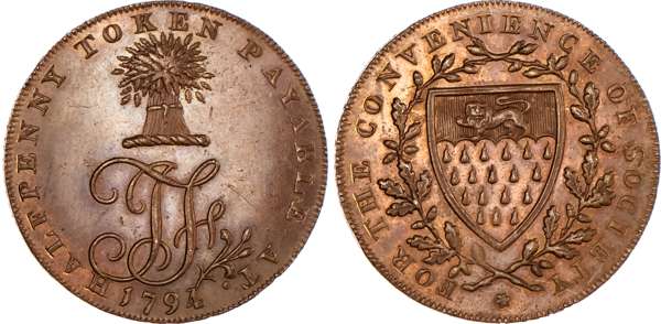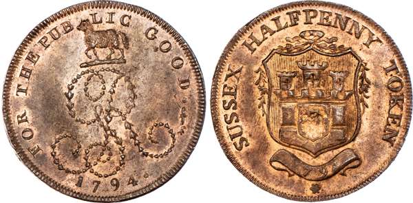 Frant, George Ring (mercer draper) Halfpenny 1794, Sheep crest over GR cypher, rev. Arms of Chichester, edge PAYABLE BY G RING FRANT++++, 28mm/9.16gm. (DH 23). Hastings, James Tebay (ironmonger and auctioneer) Halfpenny 1794, a sloop, rev. Arms of Hastings, edge, PAYABLE BY JAMES+++++, 30mm/9.58gm. (DH 24). Another the same but edge PAYABLE BY W MYNS GOUDHURST +++++, 30mm/9.58gm. (DH 24a). Another similar but bottom leaf of palm points to first limb of ‘A’, edge, PAYABLE BY JAMES+++++, 30mm/9.61gm. (DH 25 bis). Northiam, John Foller (probably J Fuller, a grocer) Halfpenny 1794, wheatsheaf crest over JF cypher, rev. Arms of Chichester, edge PAYABLE AT JOHN FOLLER NORTHIAM .x.x, 29mm/9.96gm. (DH 34). Northiam, Elias Gilbert, (gentleman farmer, grocer and blacksmith), Squirrel crest over EG cypher, rev. Gilbert arms), edge PAYABLE AT GILBERTS NORTHIAM .x.x.x.x.x., 29.25mm/9.28gm. (DH 35), all good Extremely Fine with hints of original colour, DH 24 and 25 bis a little weakly struck, last unpublished with this edge and of the highest rarity. [6] £180‑220 DH 24 and 35 ex Baldwin’s basement Feb 2018; DH 24a and 24 bis ex F S Cokayne Col., his tickets – DH 24a bought 30 Dec 1905 from J Atkins for 10/- and DH 24 bis ex Luther Clements Col. bought 14 Mar 1911 for 1/6. Acquired AHB c. 1946.