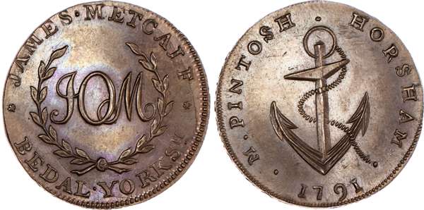 Horsham. Skidmore’s mule Halfpenny 1795, Bust of George III right, rev. view of St Paul’s Covent Garden in ruins (as Middx (522), edge SKIDMORE HOLBORN LONDON ooo .. .. .., 29.25mm/12.38gm. (DH 31). Another mule, Bedale TOM cypher (as Yorks 9), rev. cable and anchor, edge SKIDMORE HOLBORN LONDON ooo .. .. .., 29mm/13.05gm. (DH 32), First uncirculated but polished in antiquity, second good Extremely Fine with pleasing brown/blue iridescent toning, both very rare ‘RR’. [2]