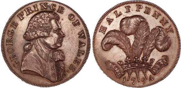 Winchelsea, Richard Maplesden (grocer and draper) bronzed Halfpenny 1794, Bust of Prince of Wales right, rev. Prince of Wales Plumes, edge PAYABLE AT RICHARD MAPLESDEN WINCHELSEA .x., 30mm/9.97gm. (DH 39), good Extremely Fine nicely bronzed and well struck from deeply engraved dies. Of the highest rarity, ‘RRR’.