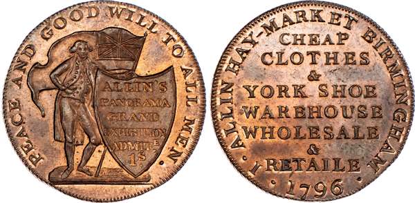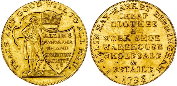 Birmingham, John Allin (clothes and shoes seller) Halfpenny 1796, Man holding Union flag and advertisement, rev. 8-line legend, edge diagonally engrailed, 29mm/10.91gm. (DH 62), Another the same but gilded, 29.5mm/10.69gm. (DH 62), first as struck with almost full mint lustre, second Extremely Fine or better with even gilding, this extremely rare ‘RRR’. [2]